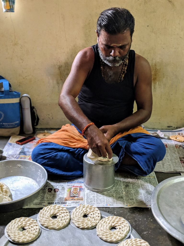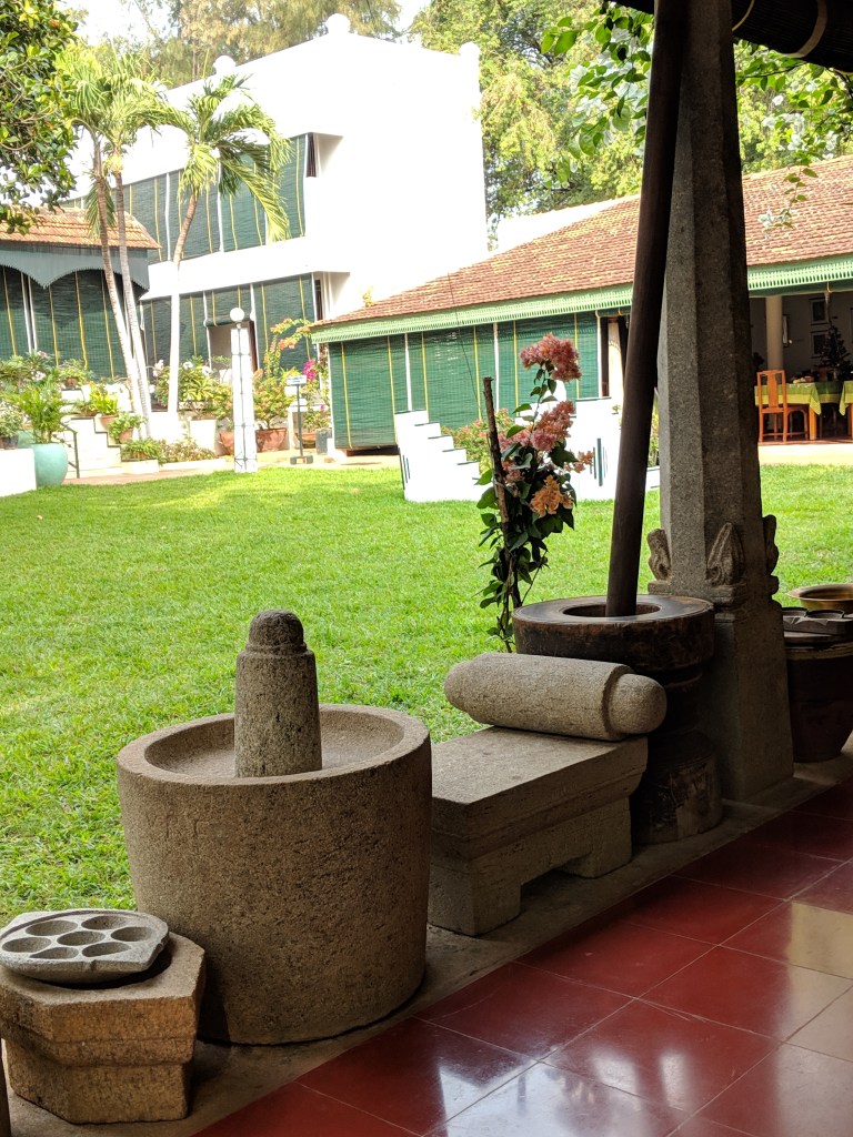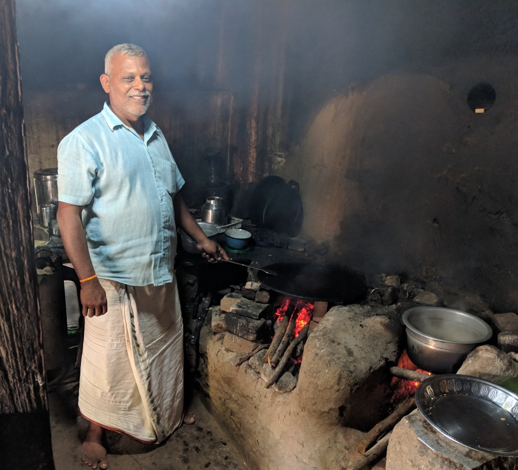 The next day greeted us with a touch of village life and another traditional Chettinad breakfast! Later in the morning, we were warmly welcomed into the rustic kitchen of Meenakshi Vilas – a two-room home – filled with love – where they cook in one and serve in the other (their living room).